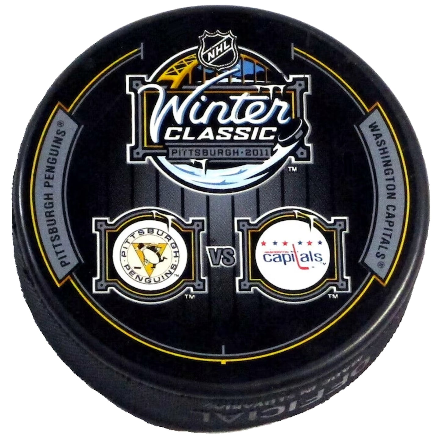 This puck commemorates the 2011 NHL Winter Classic held in Pittsburgh on January first, 2011. It featured the Washington Capitals vs the Pittsburgh Penguins.