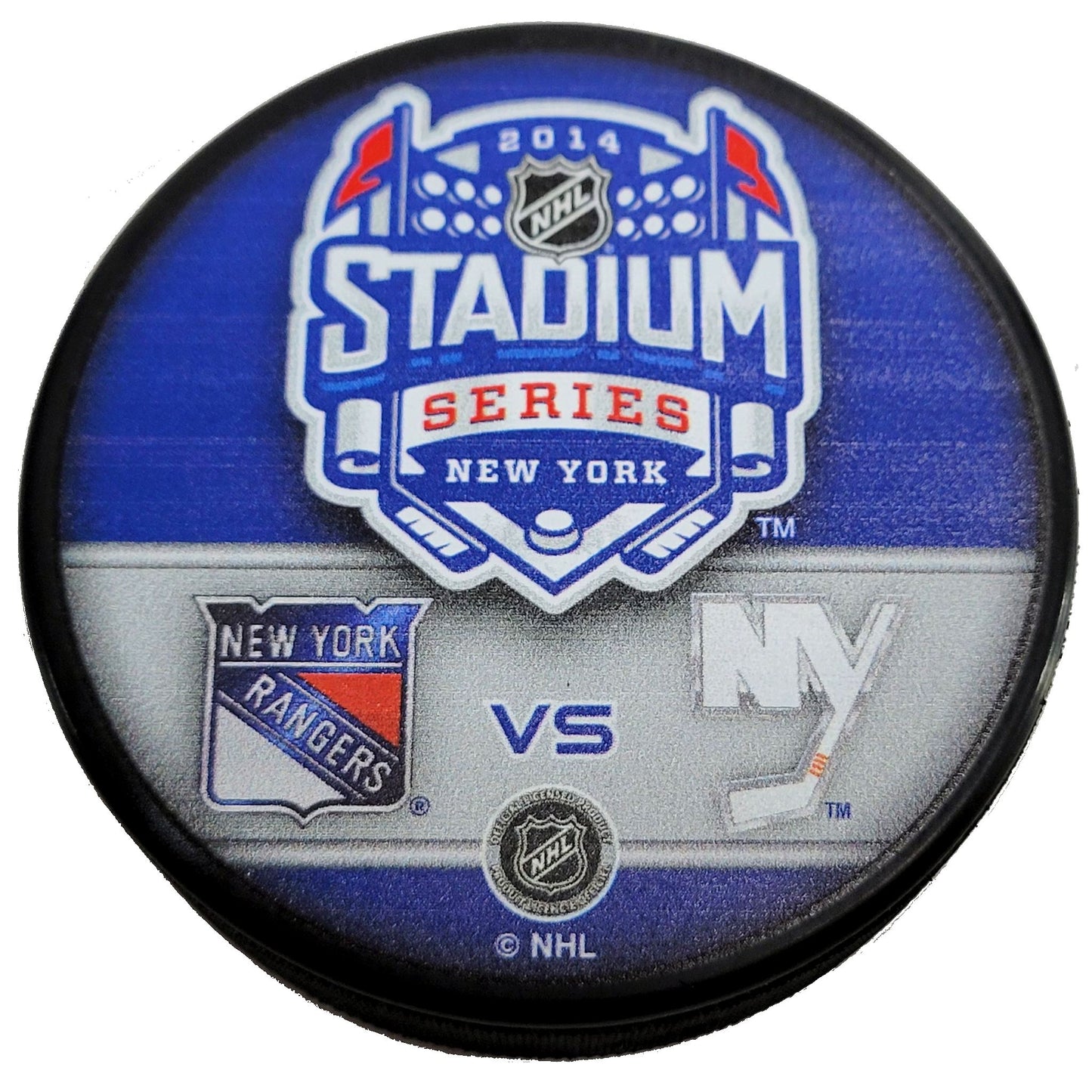This puck commemorates the 2014 NHL NY Stadium Series held in NY in January, 2014. It featured the NY Rangers vs NY Islanders.