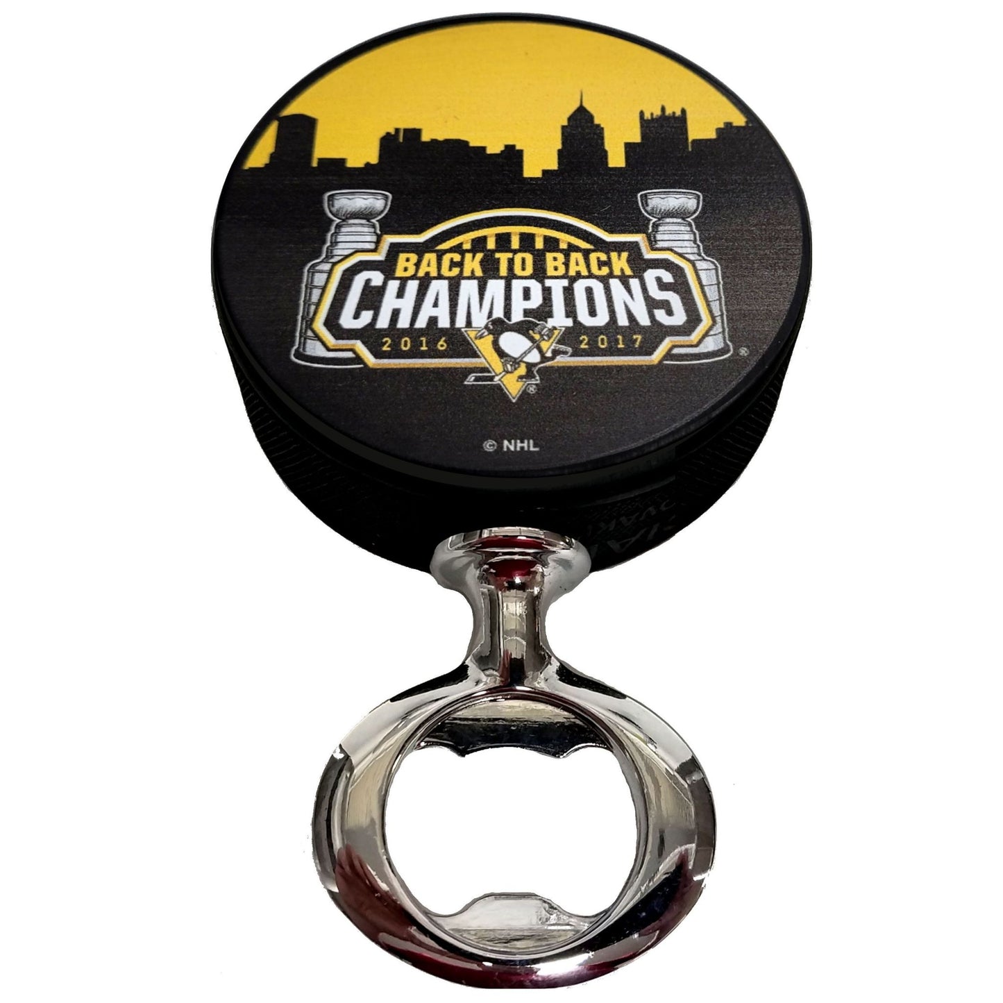 Pittsburgh Penguins 'Back To Back' 2016-2017 Stanley Cup Champions FULCRUM Series Hockey Puck Bottle Opener. Take pride in serving up your favorite drinks with our custom hockey puck bottle opener. Handcrafted in the USA from an actual licensed hockey puck