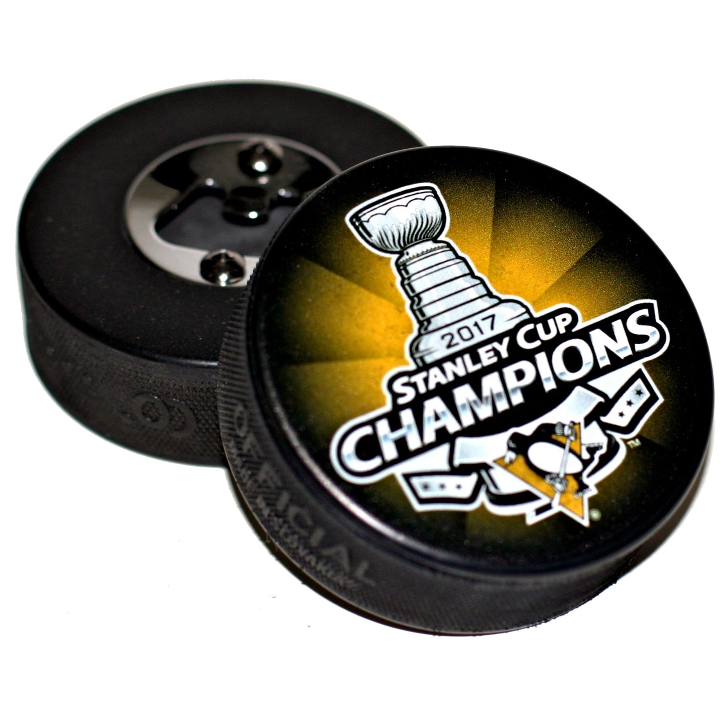 2017 Pittsburgh Penguins Stanley Cup Champions Hockey Puck Bottle Opener. Take pride in serving up your favorite drinks with our custom bottle opener. Handcrafted in the USA from an actual licensed collectible hockey puck.