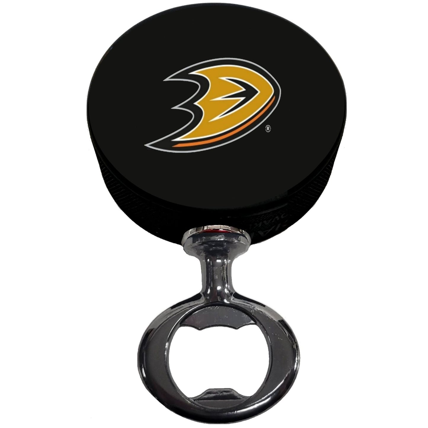 Anaheim Ducks Black Nickel Colored FULCRUM Series Hockey Puck Bottle Opener. Take pride in serving up your favorite drinks with our custom hockey puck bottle opener. Handcrafted in the USA from an actual licensed hockey puck