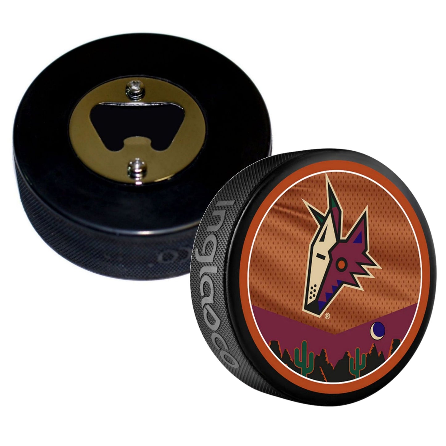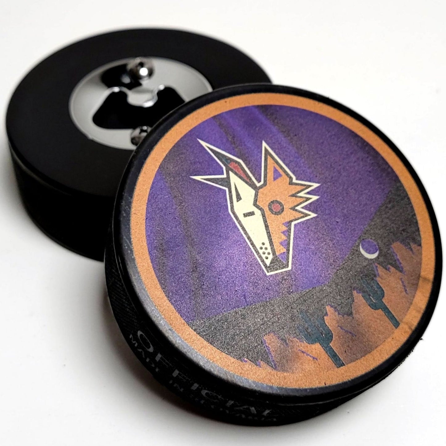 Arizona Coyotes Reverse Series Hockey Puck Bottle Opener. Take pride in serving up your favorite drinks with our custom bottle opener. Handcrafted in the USA from an actual licensed collectible hockey puck.
