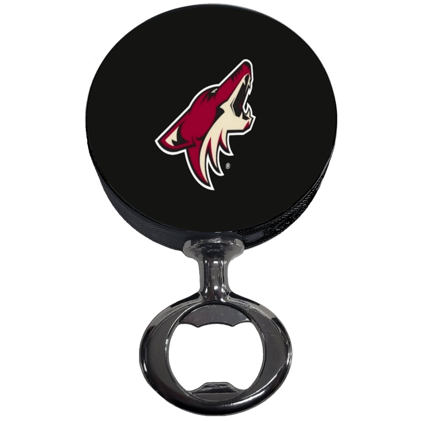 Arizona Coyotes Throwback Logo Black Nickel Colored FULCRUM Series Hockey Puck Bottle Opener. Take pride in serving up your favorite drinks with our custom hockey puck bottle opener. Handcrafted in the USA from an actual licensed hockey puck