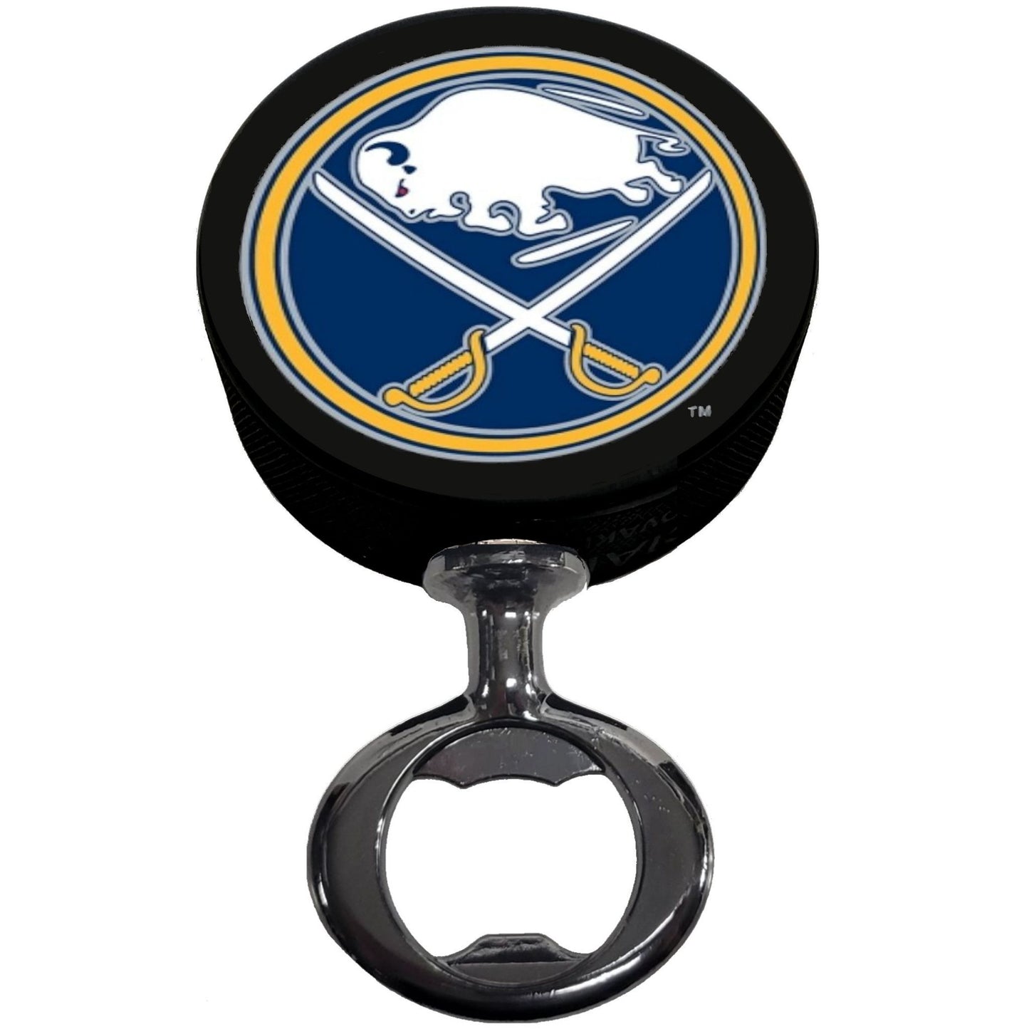 Buffalo Sabres Black Nickel Colored FULCRUM Series Hockey Puck Bottle Opener. Take pride in serving up your favorite drinks with our custom hockey puck bottle opener. Handcrafted in the USA from an actual licensed hockey puck