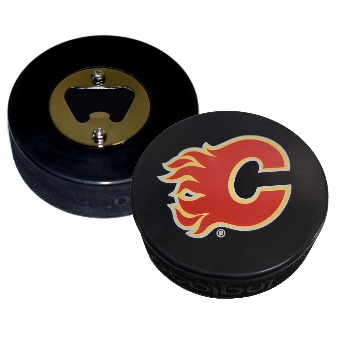 Calgary Flames Basic Series Hockey Puck Bottle Opener. Take pride in serving up your favorite drinks with our custom bottle opener. Handcrafted in the USA from an actual licensed collectible hockey puck. It makes a unique and wonderful gift for hockey fans!