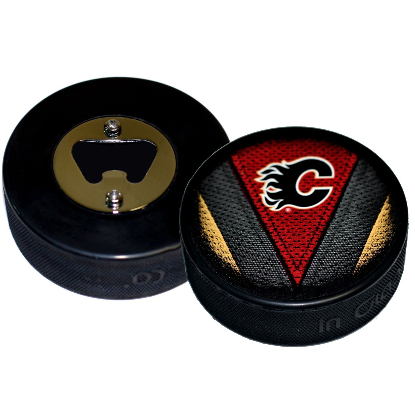 Calgary Flames Stitch Series Hockey Puck Bottle Opener. Take pride in serving up your favorite drinks with our custom bottle opener. Handcrafted in the USA from an actual licensed collectible hockey puck.