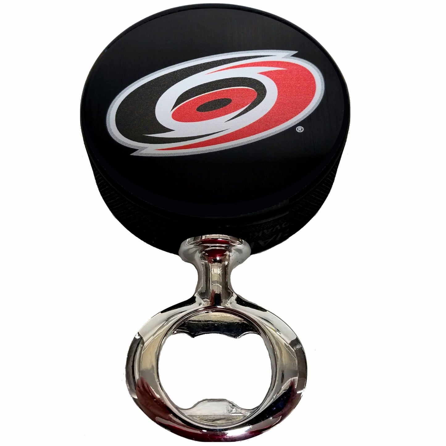 Carolina Hurricanes FULCRUM Series Hockey Puck Bottle Opener. Take pride in serving up your favorite drinks with our custom hockey puck bottle opener. Handcrafted in the USA from an actual licensed hockey puck