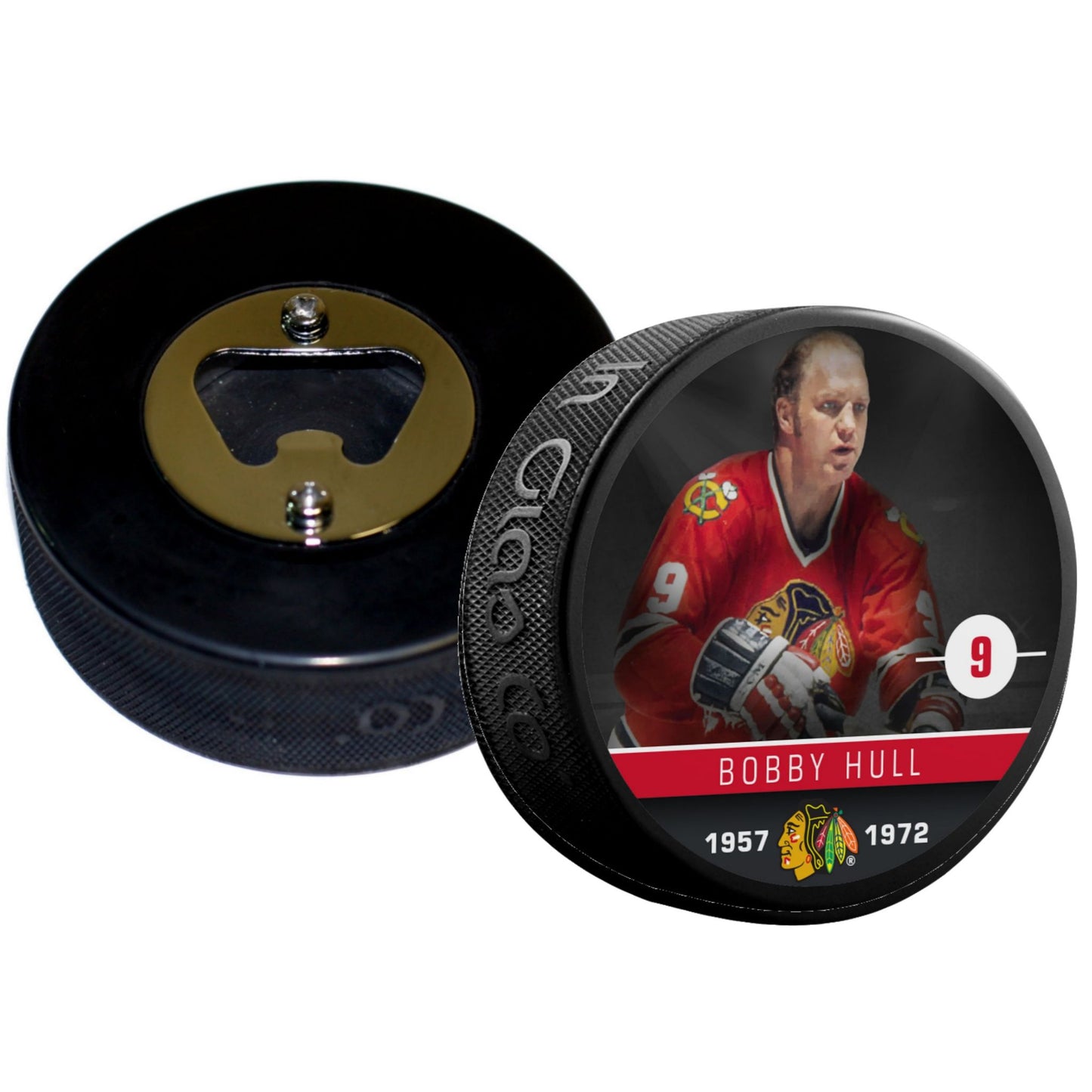 Chicago Blackhawks Bobby Hull Player Series Hockey Puck Bottle Opener. Take pride in serving up your favorite drinks with our custom bottle opener. Handcrafted in the USA from an actual licensed collectible hockey puck.