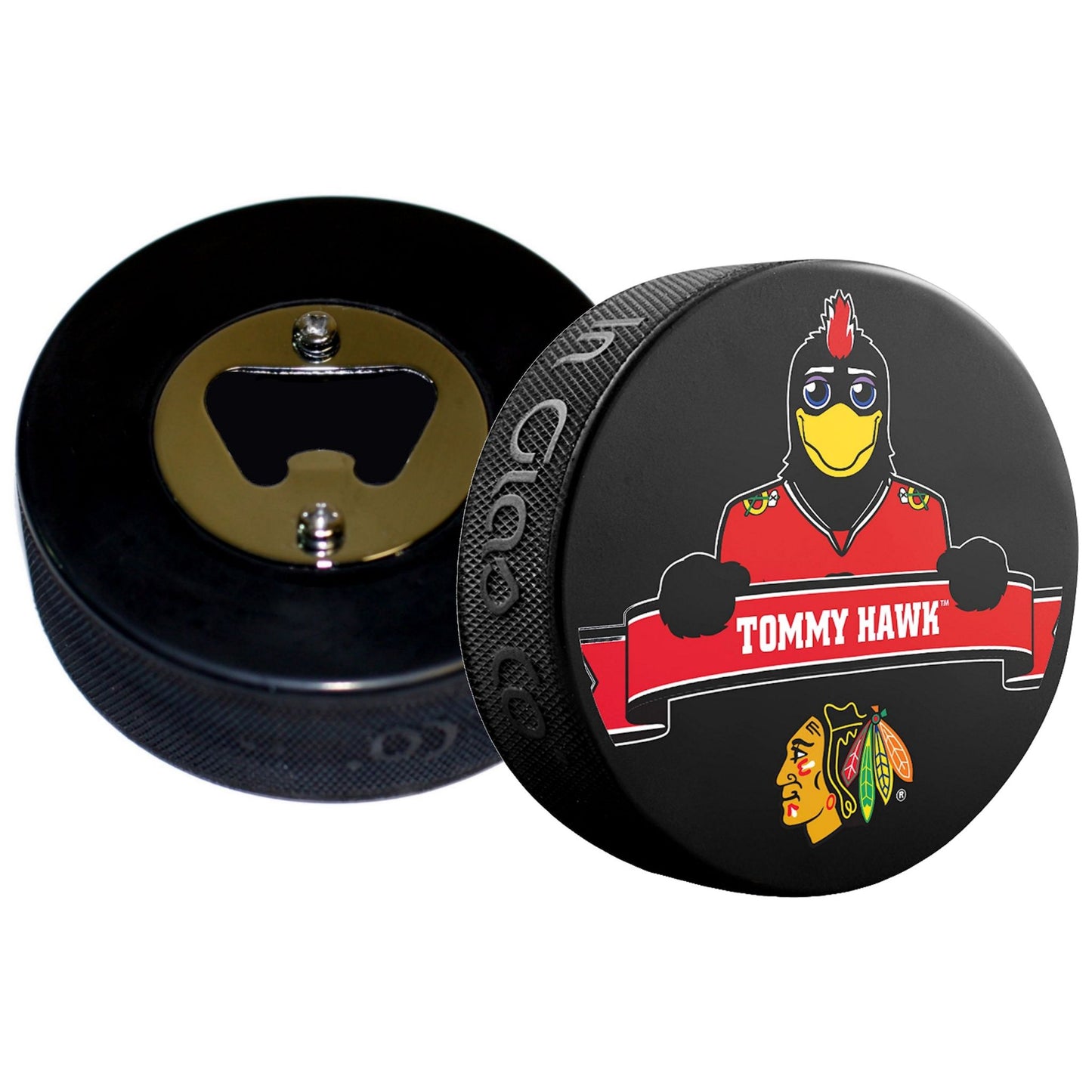 Chicago Blackhawks Mascot Tommy Hawk Hockey Puck Bottle Opener. Take pride in serving up your favorite drinks with our custom bottle opener. Handcrafted in the USA from an actual licensed collectible hockey puck.