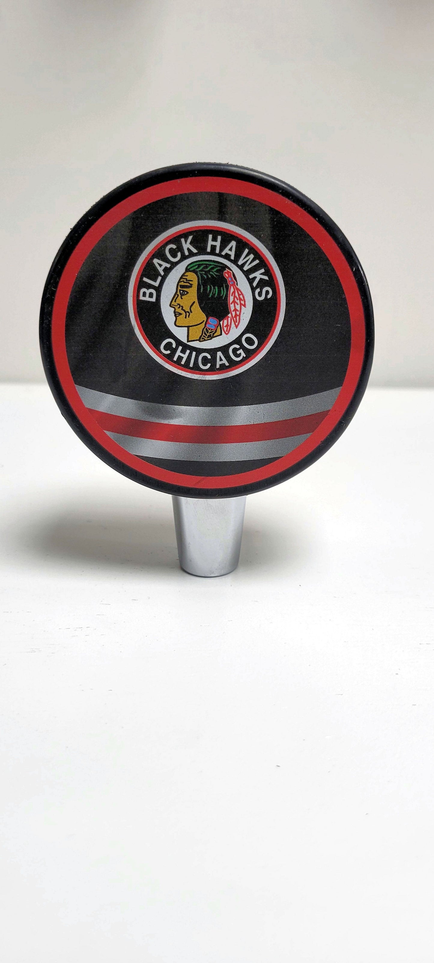 Chicago Reverse Series Hockey Puck Beer Tap Handle. Take pride in serving up your favorite beers with our custom beer tap handle. Handcrafted in the USA from an actual licensed collectible hockey puck. Even if you don't have a beer dispensing system or kegerater, it makes a unique and wonderful gift for hockey fans!