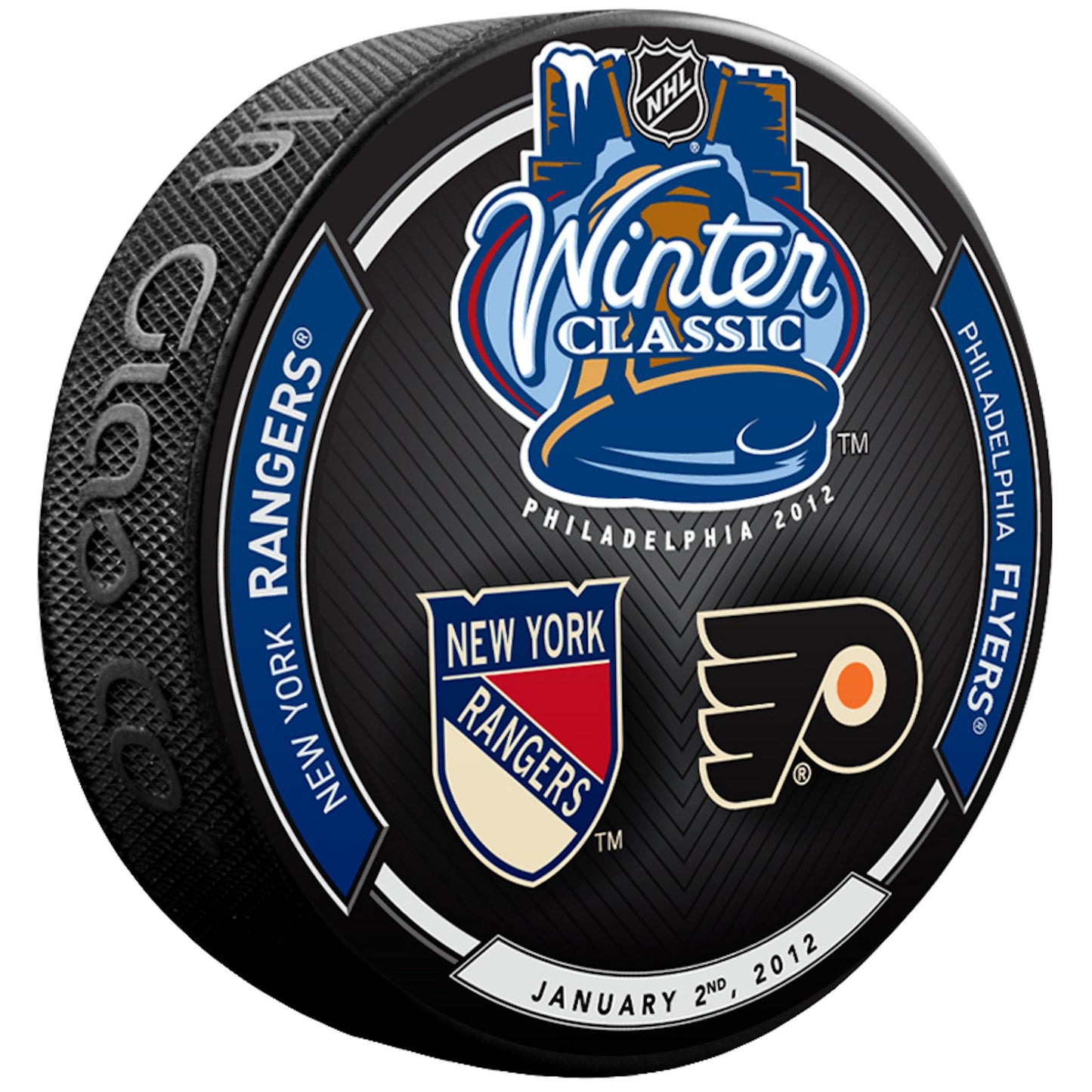 This puck commemorates the 2012 NHL Winter Classic held in Philadelphia on January second, 2012. It featured the NY Rangers vs Philadelphia Flyers.