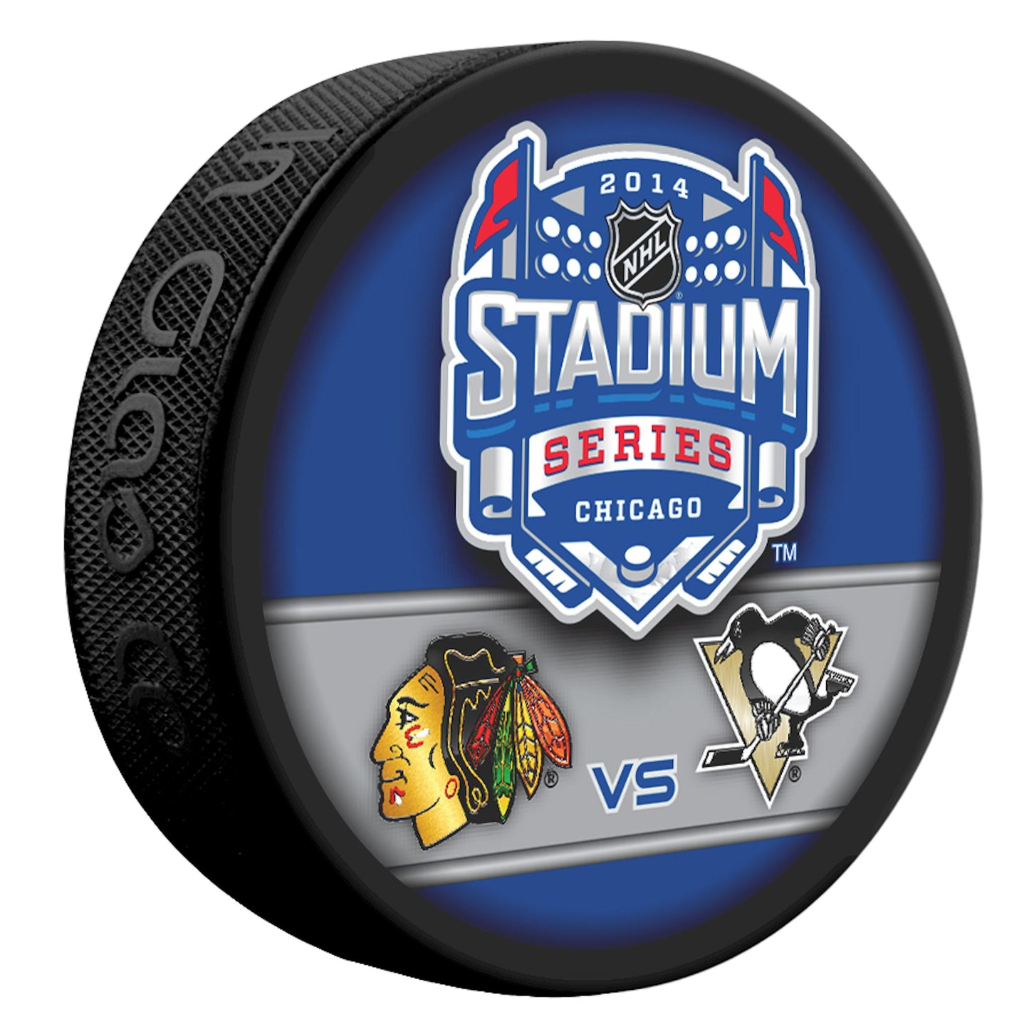 This puck commemorates the 2014 NHL Chicago Stadium Series held in Chicago in March, 2014. It featured the Chicago Blackhawks vs Pittsburgh Penguins.