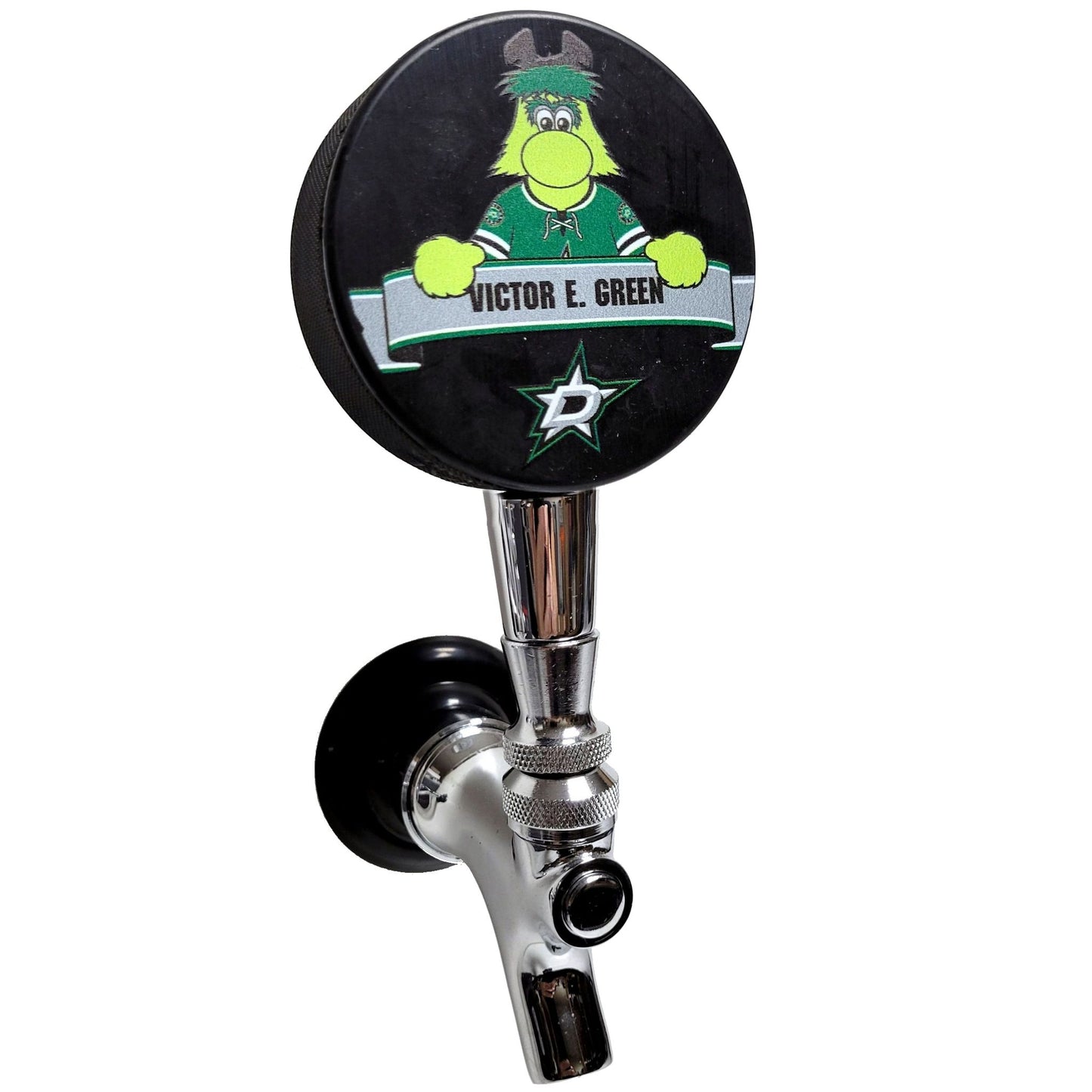 Dallas Mascot Victor E Greene Hockey Puck Beer Tap Handle. Take pride in serving up your favorite beers with our custom beer tap handle. Handcrafted in the USA from an actual licensed collectible hockey puck.