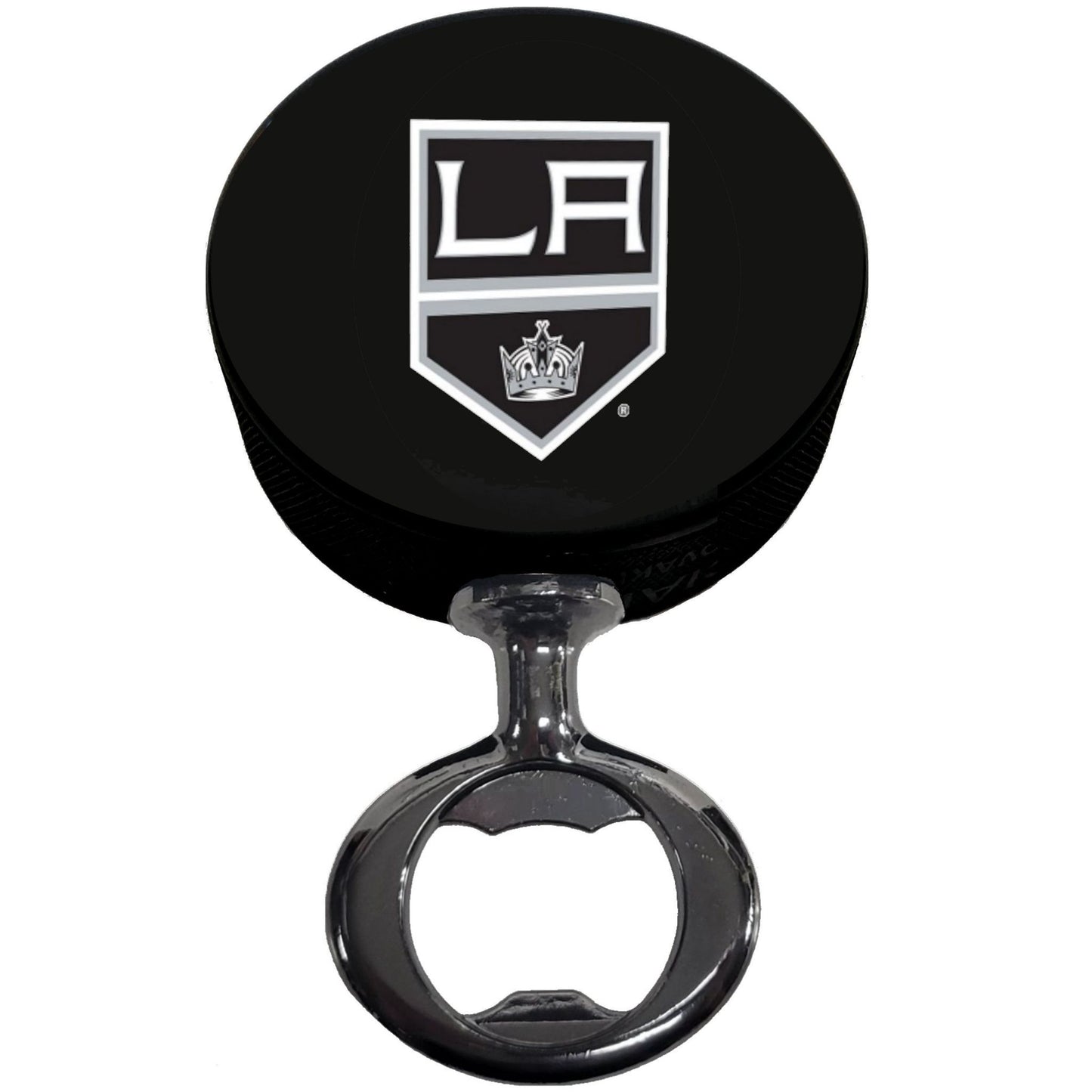 Los Angeles Kings Black Nickel Colored FULCRUM Series Hockey Puck Bottle Opener. Take pride in serving up your favorite drinks with our custom hockey puck bottle opener. Handcrafted in the USA from an actual licensed hockey puck.