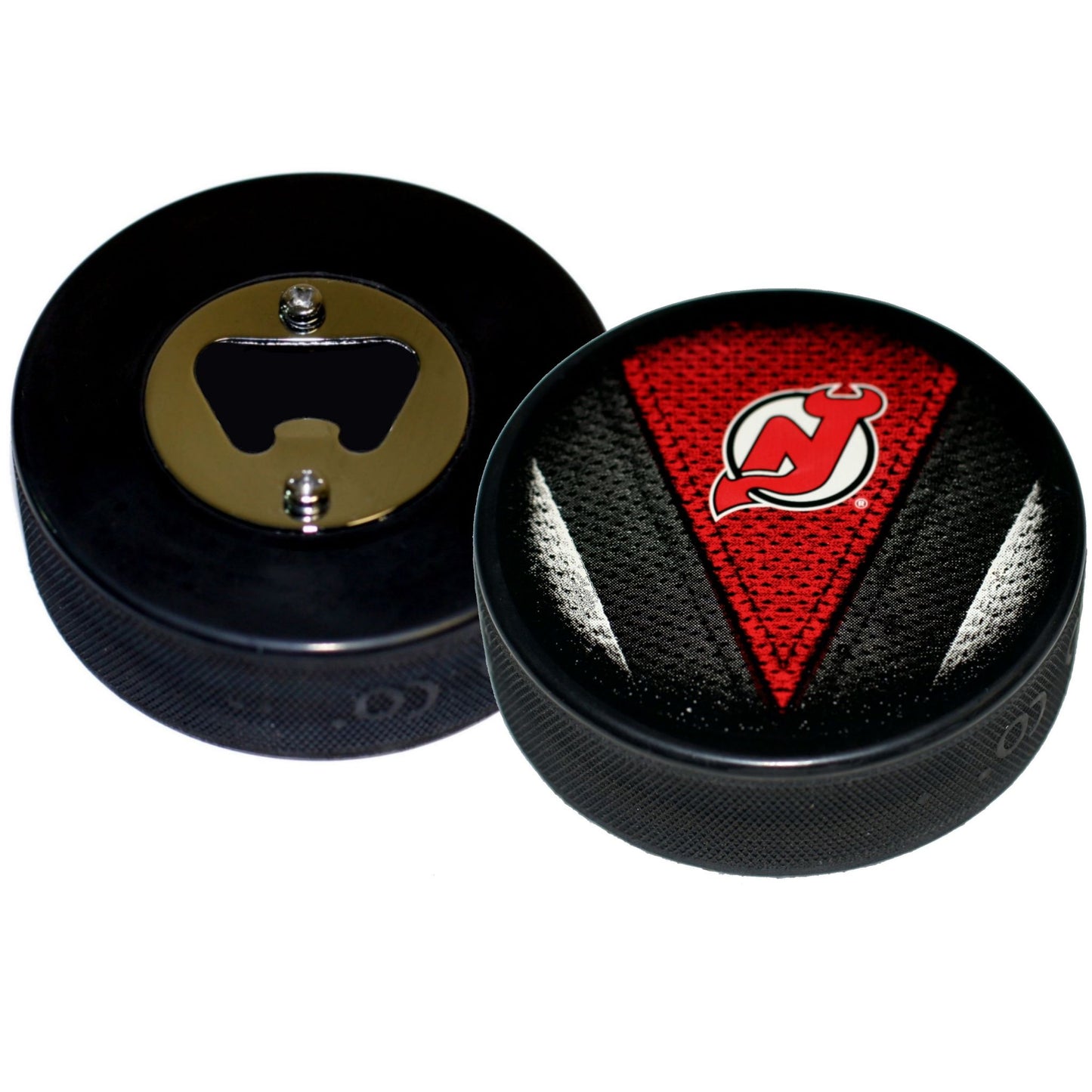 New Jersey Devils Stitch Series Hockey Puck Bottle Opener. Take pride in serving up your favorite drinks with our custom bottle opener. Handcrafted in the USA from an actual licensed collectible hockey puck. It makes a unique and wonderful gift for hockey fans!
