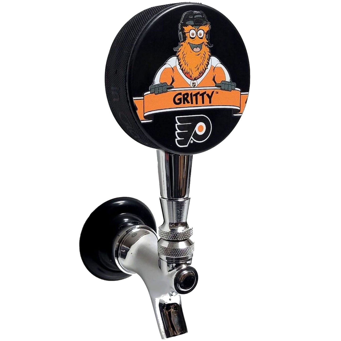 Philadelphia Flyers Gritty Mascot Hockey Puck Beer Tap Handle. Take pride in serving up your favorite beers with our custom beer tap handle. Handcrafted in the USA from an actual licensed collectible hockey puck. Even if you don't have a beer dispensing system or kegerater, it makes a unique and wonderful gift for hockey fans!