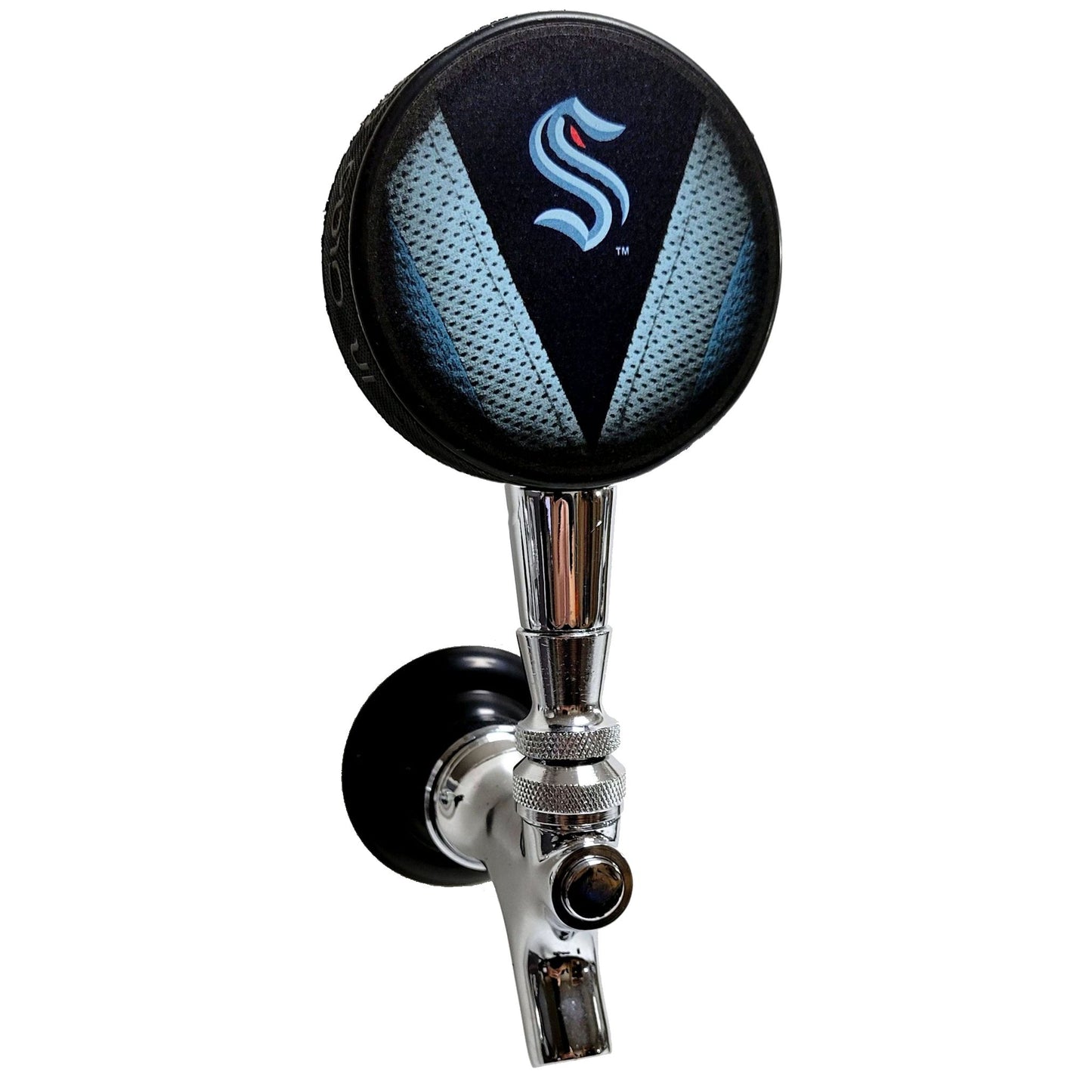 Seattle Kraken Stitch Series Hockey Puck Beer Tap Handle. Take pride in serving up your favorite beers with our custom beer tap handle. Handcrafted in the USA from an actual licensed collectible hockey puck.