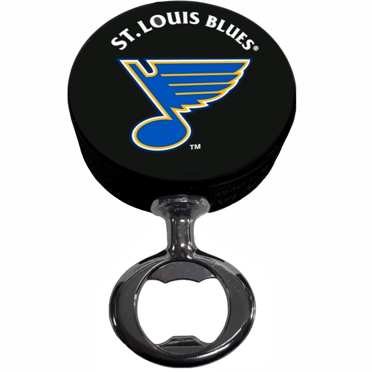St. Louis Blues Black Nickel Colored FULCRUM Series Hockey Puck Bottle Opener. Take pride in serving up your favorite drinks with our custom hockey puck bottle opener. Handcrafted in the USA from an actual licensed hockey puck