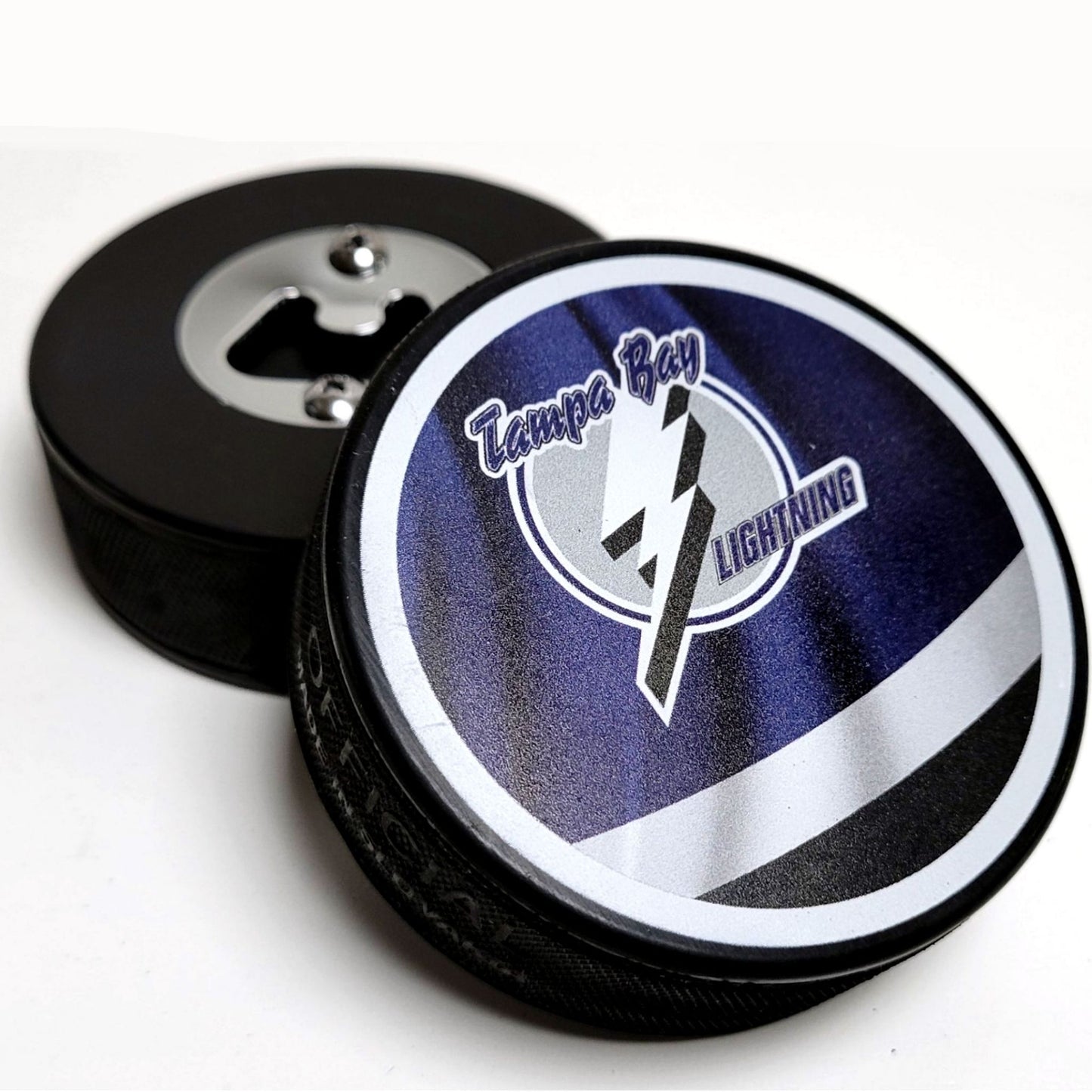 Tampa Bay Lightning Reverse Series Hockey Puck Bottle Opener. Take pride in serving up your favorite drinks with our custom bottle opener. Handcrafted in the USA from an actual licensed collectible hockey puck.