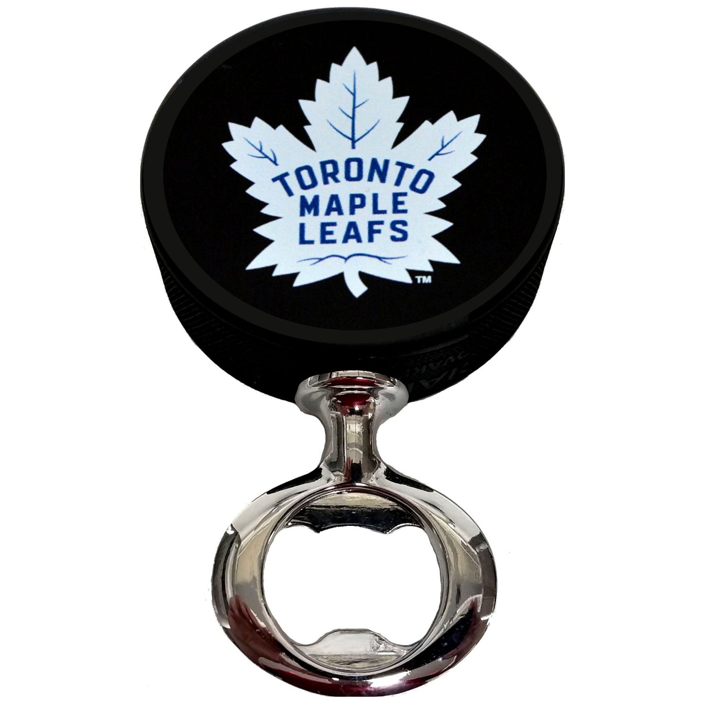 Toronto Maple Leafs FULCRUM Series Hockey Puck Bottle Opener. Take pride in serving up your favorite drinks with our custom hockey puck bottle opener. Handcrafted in the USA from an actual licensed hockey puck
