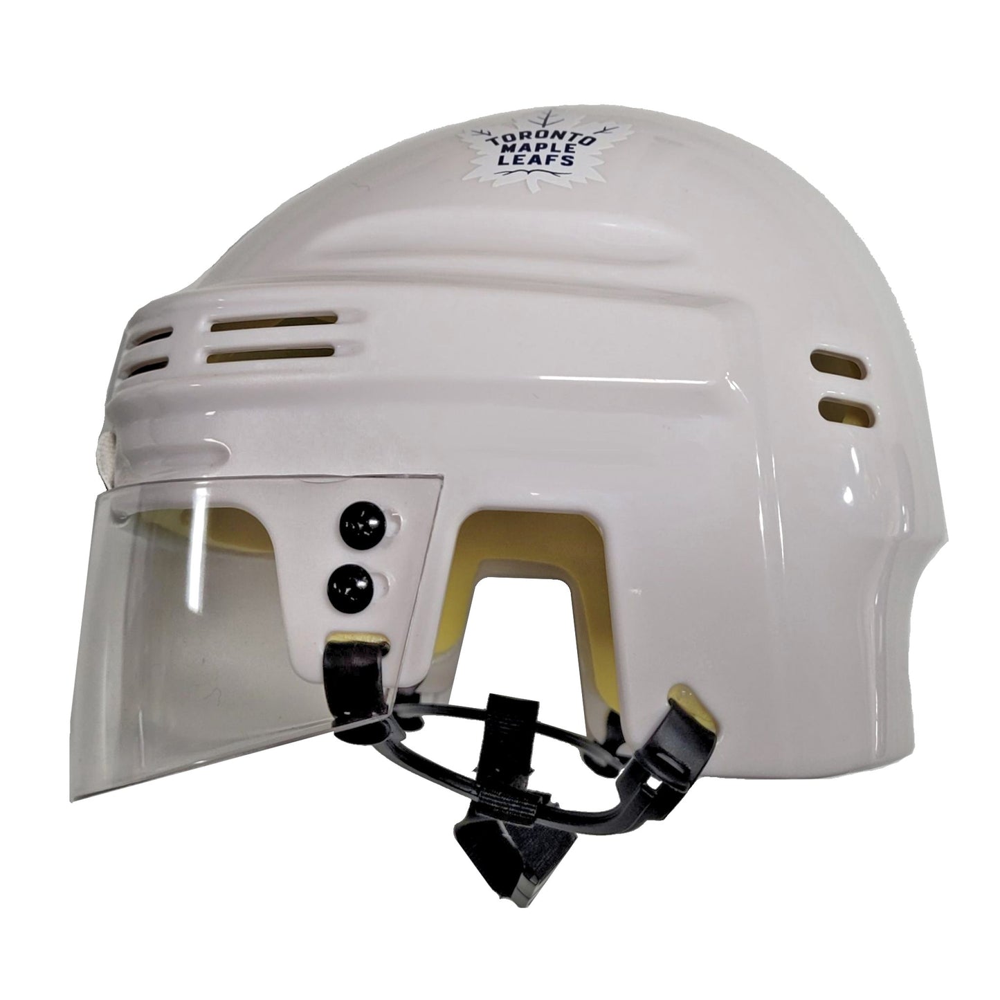 Toronto Maple Leafs White Unsigned Collectible Mini Hockey Helmet. Officially licensed NHL mini helmets are sure to delight the fan or collector. Detailed scale models include visor, ear loops, and interior padding. Clear plastic dome packaging included.