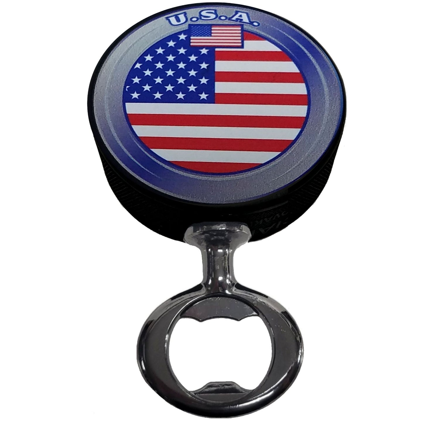 US Flag Black Nickel Colored FULCRUM Series Hockey Puck Bottle Opener