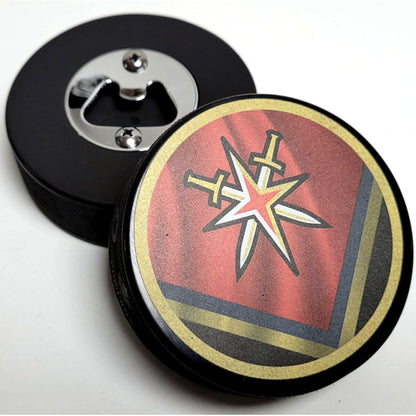 Vegas Golden Knights Reverse Series Hockey Puck Bottle Opener. Take pride in serving up your favorite drinks with our custom bottle opener. Handcrafted in the USA from an actual licensed collectible hockey puck.