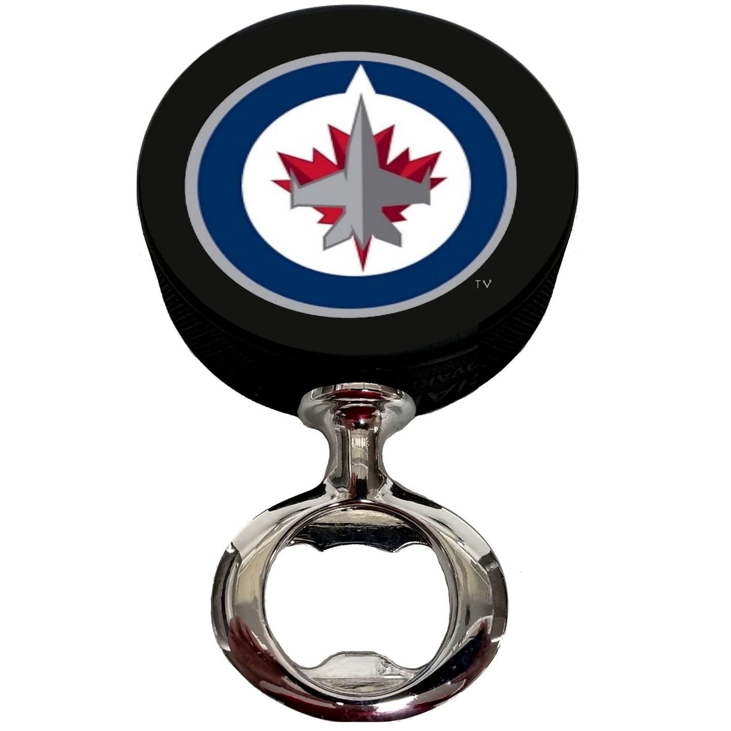 Winnipeg Jets FULCRUM Series Hockey Puck Bottle Opener. Take pride in serving up your favorite drinks with our custom hockey puck bottle opener. Handcrafted in the USA from an actual licensed hockey puck